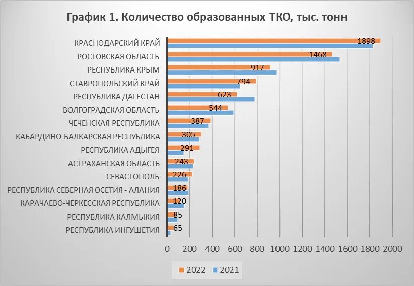 В течение последних нескольких лет в стране ежегодно генерировалось порядка 40-60 млн тонн твердых коммунальных отходов (ТКО) – бытового мусора, образующегося в результате жизнедеятельности человека в жилых кварталах, частном секторе, офисах, организациях. В отличие от ранее использовавшейся аббревиатуры ТБО (твердые бытовые отходы), термин ТКО включает также отходы, создаваемые сотрудниками предприятий. По данным Росприроднадзора в 2022 году было сформировано 45,9 млн тонн отходов, что на 5% меньше показателя 2021 года. Очевидно, что наибольшая масса приходится на самые густонаселенные и туристические территории. Среди регионов ЮФО и СКФО больше всего мусора в 2022 году было произведено в Краснодарском крае – 1,9 млн тонн, это 4% от всех отходов в стране и третье место по количеству ТКО после Москвы и Московской области. За этот же период жители донского региона произвели 1,5 млн тонн мусора — 3% от всех отходов в стране. Ростовская область наряду с Кубанью входит в десятку самых мусорящих российских субъектов. Меньше всего ТКО было образовано в Ингушетии (65 тыс. тонн) и Калмыкии (85 тыс. тонн) (см. график 1).