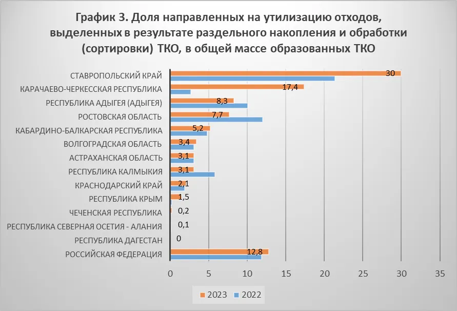 Именно по этому показателю можно судить об уровне развития в регионе обращения с отходами. На Юге в 2023 году высокую степень утилизации ТКО продемонстрировали Ингушетия (35%), Ставропольский край (30%) и Карачаево-Черкессия (17,4%) (см. график 3). При этом Ставропольскому краю и Карачаево-Черкессии удалось значительно увеличить долю утилизируемых отходов – на 8,6 п. п. и 14,7 п. п. соответственно. Остальные регионы ЮФО и СКФО не достигли плановых значений по данному критерию. В аутсайдерах оказались Дагестан, Северная Осетия и Чечня, что является логичным продолжением практически полного отсутствия обработки мусора.