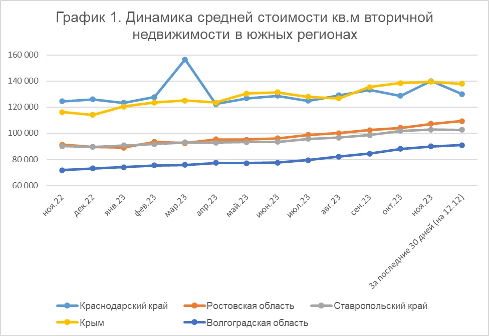 Схожая тенденция наблюдалась и в Ставропольском крае. С 90 тыс. рублей в ноябре 2022 года цена квадратного метра подросла на 14%, до 102,6 тыс. рублей. Период наиболее активного роста пришелся на второе полугодие нынешнего года. В Крыму цены «скакали» то вверх, то вниз. Относительно ноября 2022 года повышение составило 19%, за последний месяц анализируемого периода зафиксировано снижение в 1%.