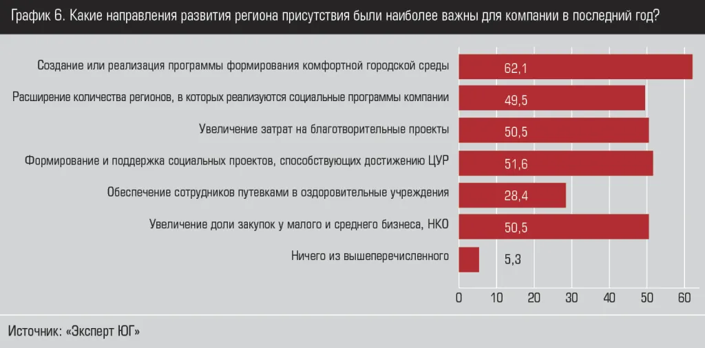 Многие компании заявляют о конкретных небольших мероприятиях, проведенных за последний год, - отказ от бумажных чеков, установка контейнеров для раздельного сбора мусора, включение в переработку отдельных отходов, сокращение энергопотребления, стимулирование волонтерства в коллективах, появление специальных инструкций, отражающих ESG-принципы, в ряде случаев компании говорят о коррективах и даже кардинальных изменениях в стратегии компании. В целом, 85% респондентов сегодня считают, что текущие условия привлекательны для увеличения активности в рамках ESG-повестки.Мы задали вопрос о том, какие направления экологического блока ESG-повестки были наиболее важны для компании в последний год. Больше всего компании работают над вторичной переработкой сырья (63%), обеспечением переработки всех отходов (53%) и формирование программ в сфере экологии, которые не связаны с деятельностью организации (46%) (см. график 4).